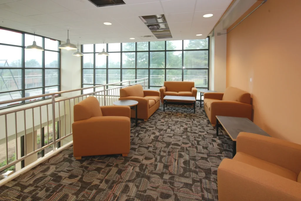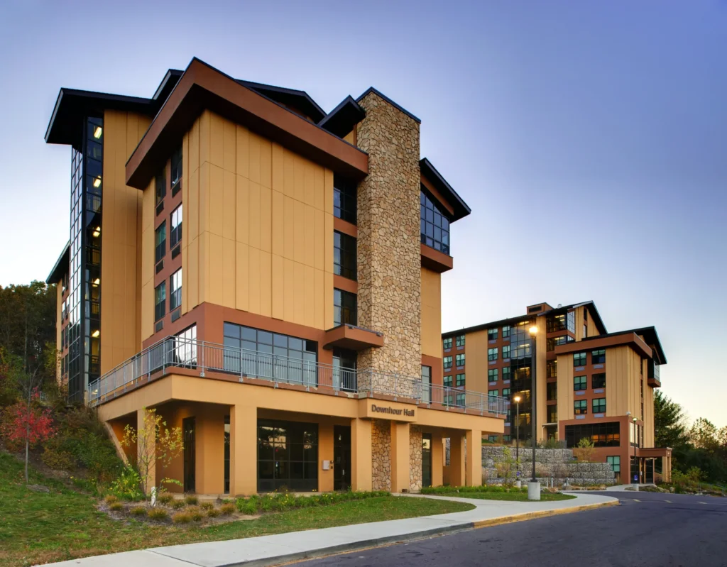 Ruscilli was selected by Hocking College to construct its new 402-bed student housing facilities. Two residence halls were constructed on the side of a hill containing mine shafts abandoned in the 1930’s. The mines had to be grouted and a deep foundation was put in place for the two structures. A cost-effective approach was implemented using a steel staggered truss system to frame the two seven-story buildings with a minimal amount of columns. Major rerouting of campus traffic patterns was necessary during the 16-month construction schedule without disrupting the ongoing college activities.