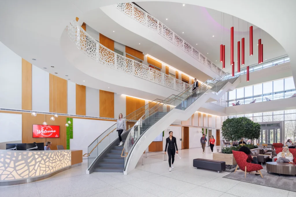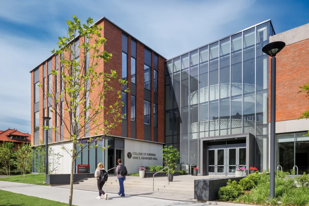 Situated prominently on a gateway corner to both main campus and the Wexner Medical Center, the addition to Newton Hall sets the tone for visitors arriving to campus from the South, inspiring students and faculty through its innovative architecture and healthy, inspiring interior and exterior environments. A few significant architectural solutions include: